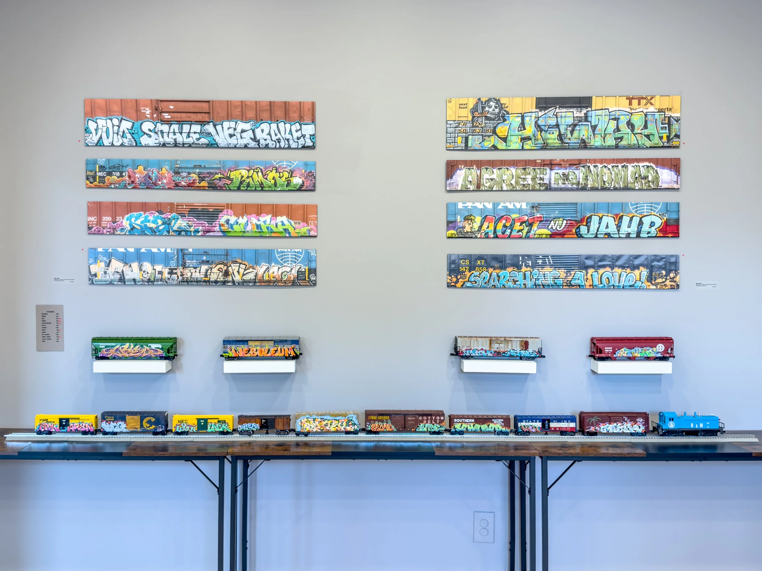 A center feature of the exhibition showcases panoramic photographs by Nick Gervin and O Scale model train cars painted by various artists.